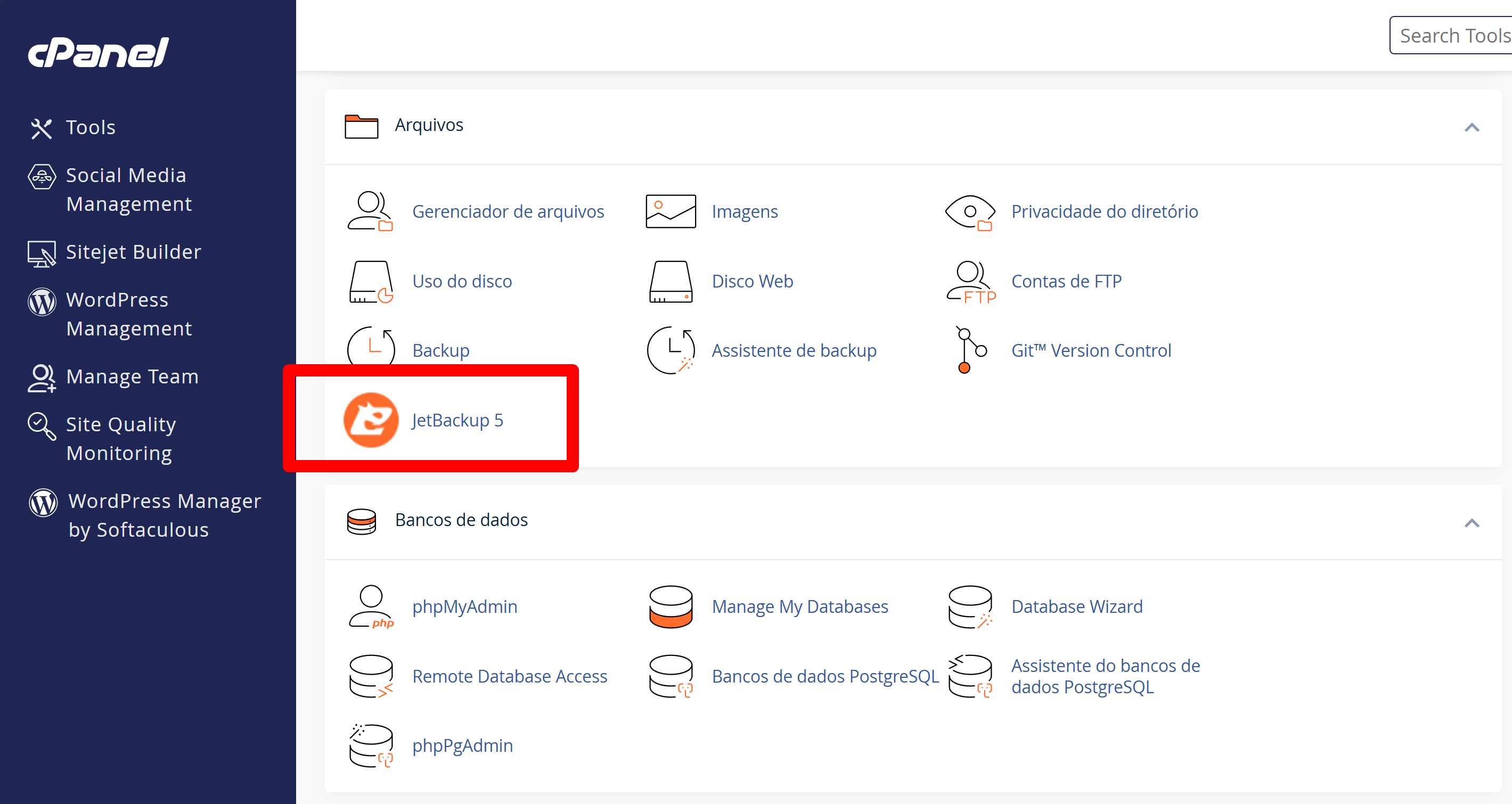 Dentro de cPanel, localice la sección Archivos y haga clic en JetBackup 5.
