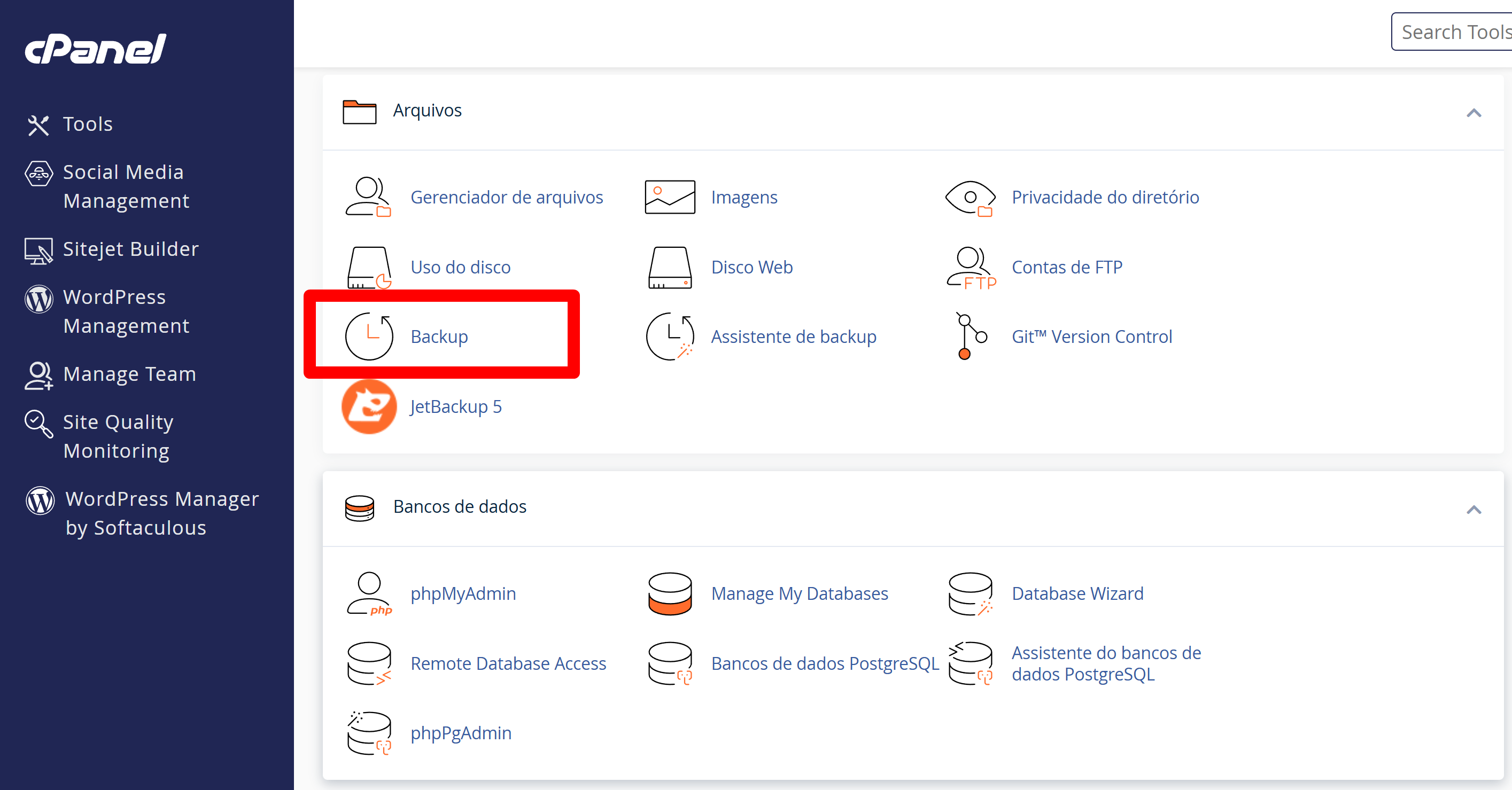 Quando a intenção é baixar o backup completo da conta, gerar arquivo para migração ou salvar localmente, o caminho correto não é o JetBackup. Utilize o Backup nativo do cPanel.