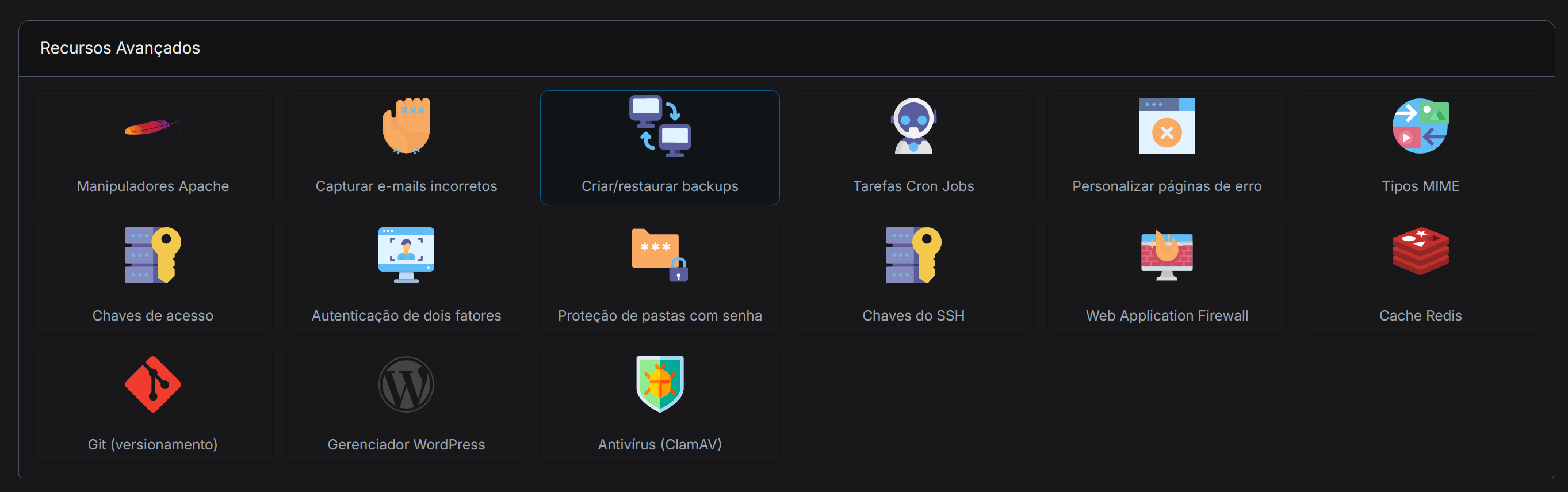 Recupera arquivos, bancos, e-mails, domínios e toda a configuração da hospedagem.