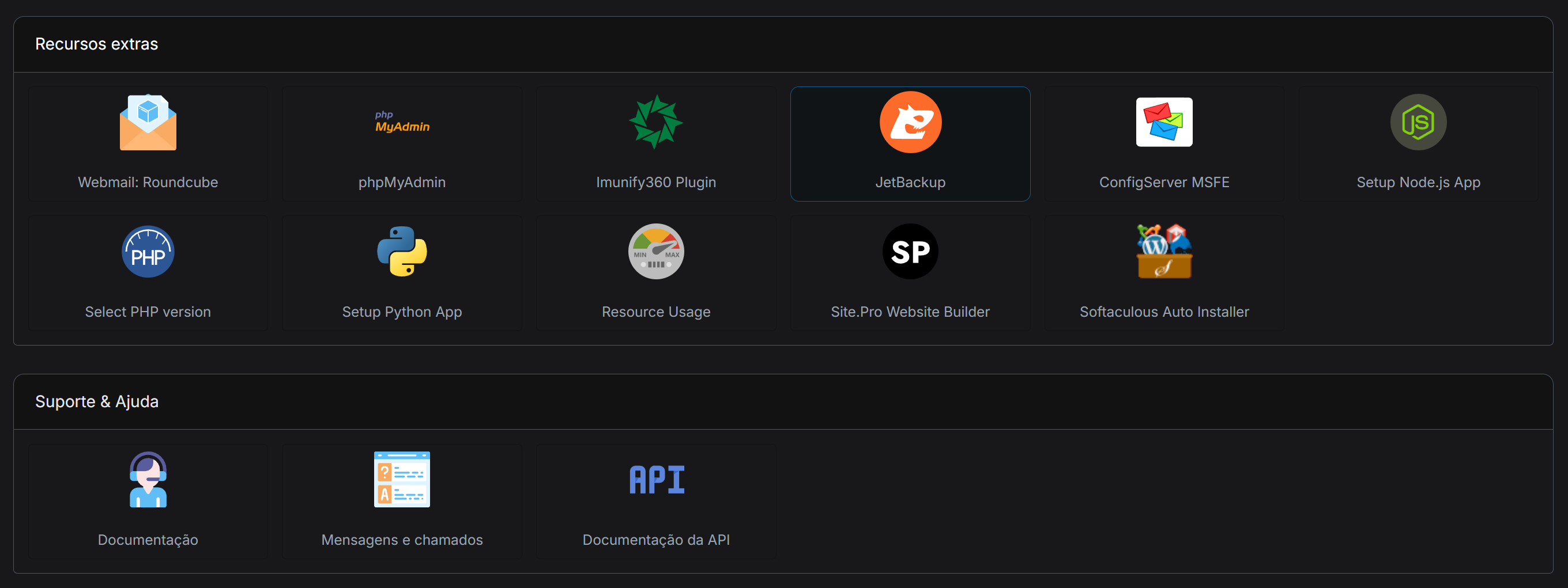 Dependendo do tema do painel, o JetBackup pode aparecer como ícone isolado ou dentro do grupo Recursos Extras.
