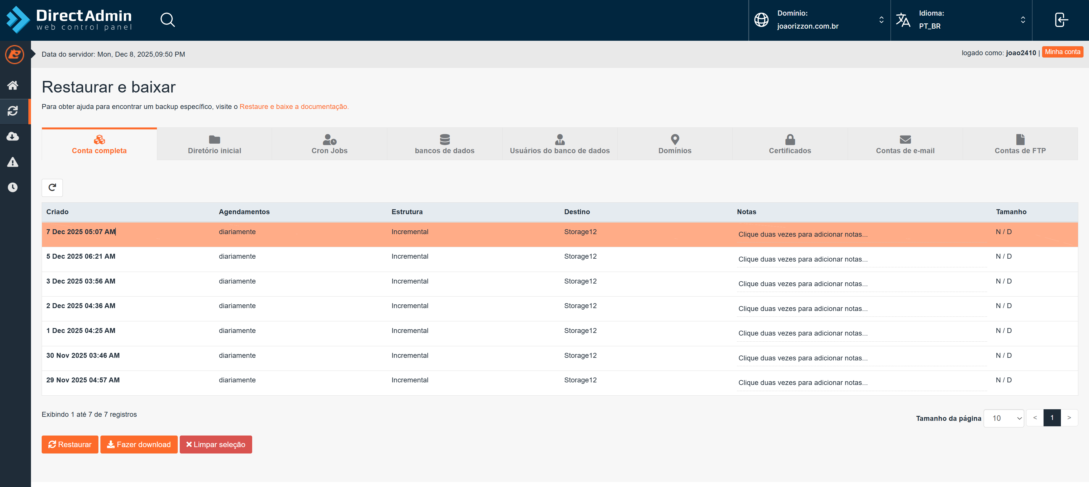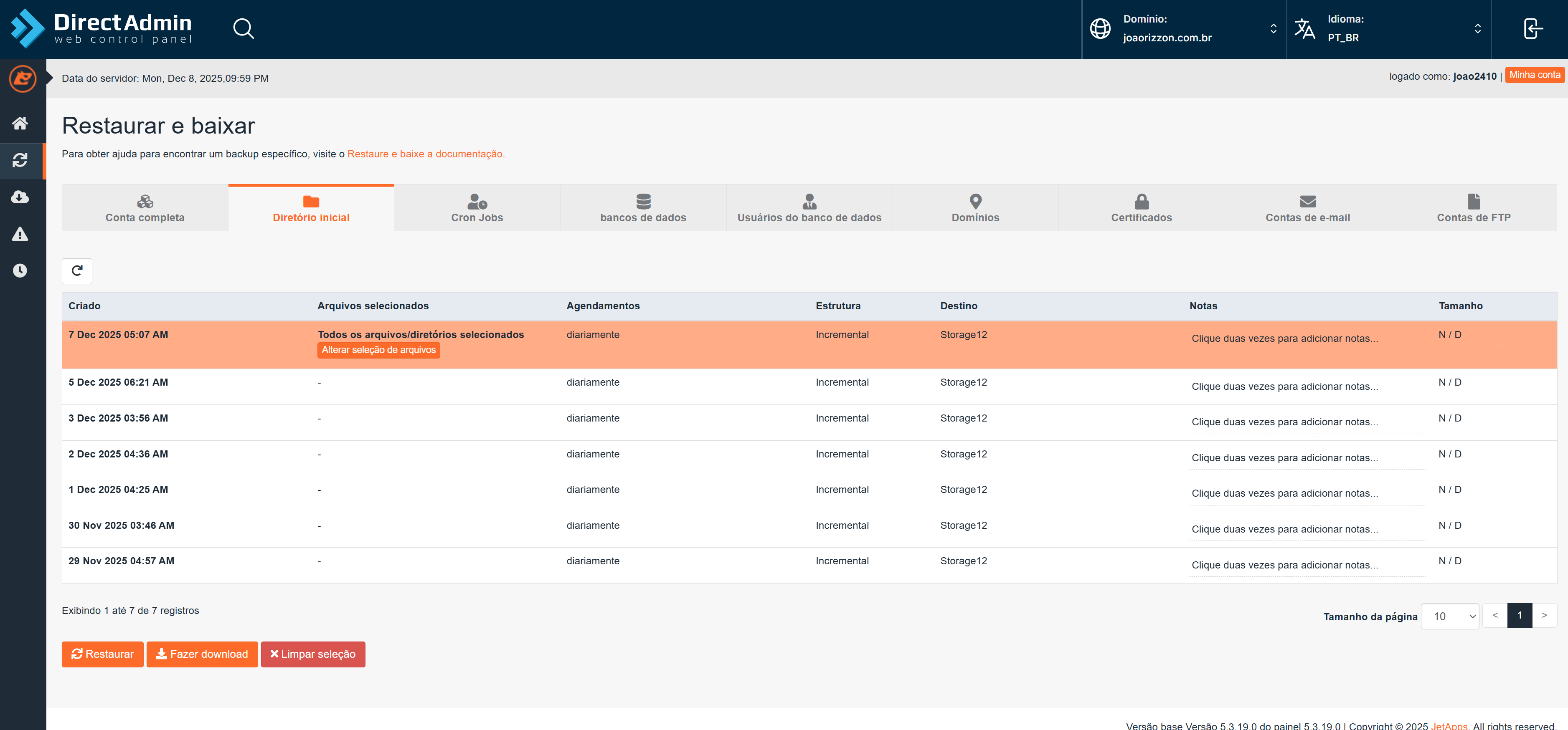Observação: no DirectAdmin, a restauração parcial não abre seleção avançada de arquivos como no cPanel. Tudo que pertence ao diretório inicial será sobrescrito.